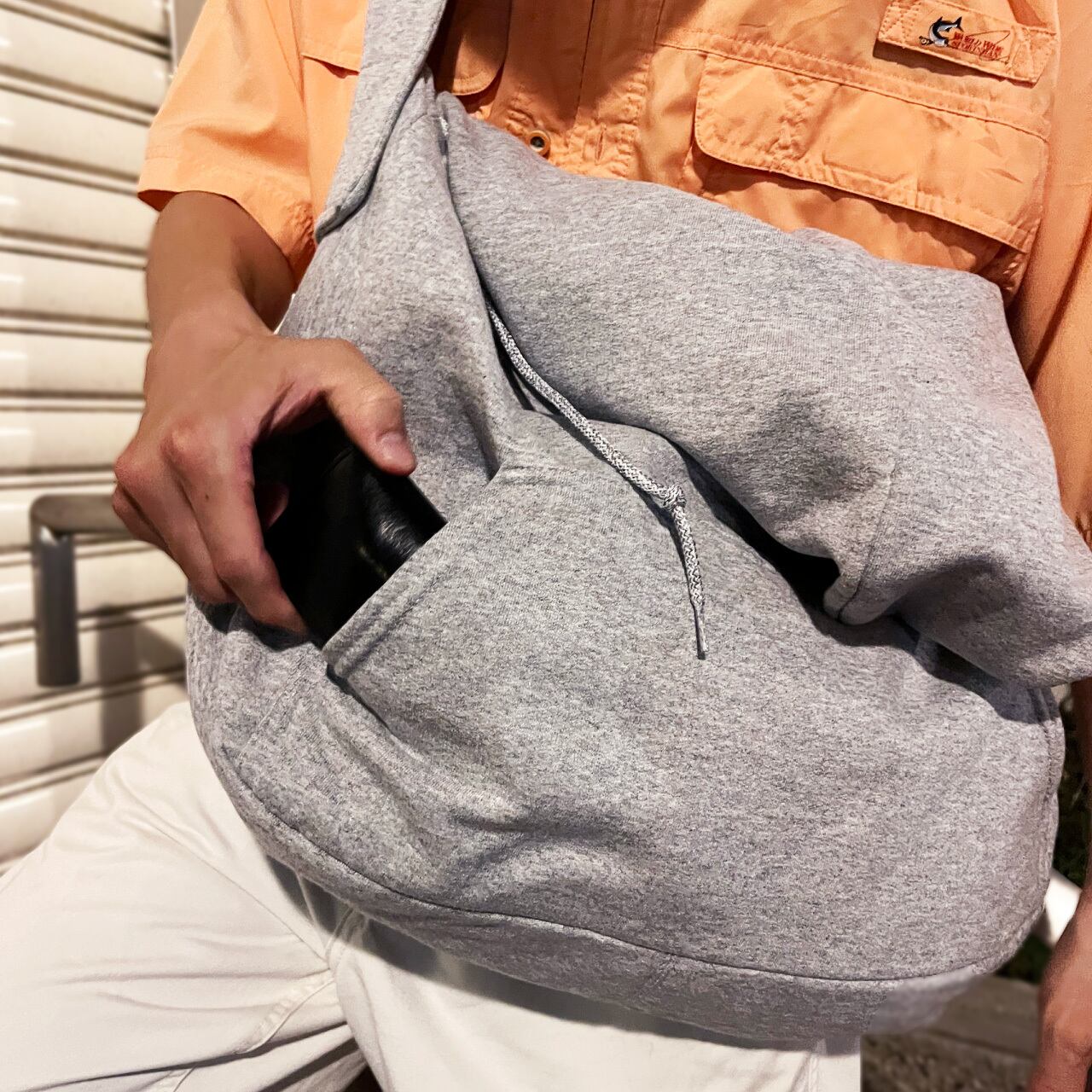 カンガルーポケットやバッグトップのフードフラップ、元のプリントなど、フーディの面影を残し、他にはない面白い仕上がりになりました!
