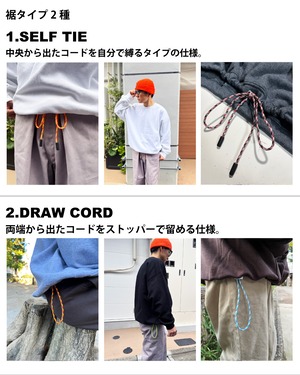 裾の仕様はコードを自分で縛るタイプの「SELF TIE」と、両端から出たコードをストッパーで留めるタイプの「DRAW CORD」の2種類からお選びいただけます。
