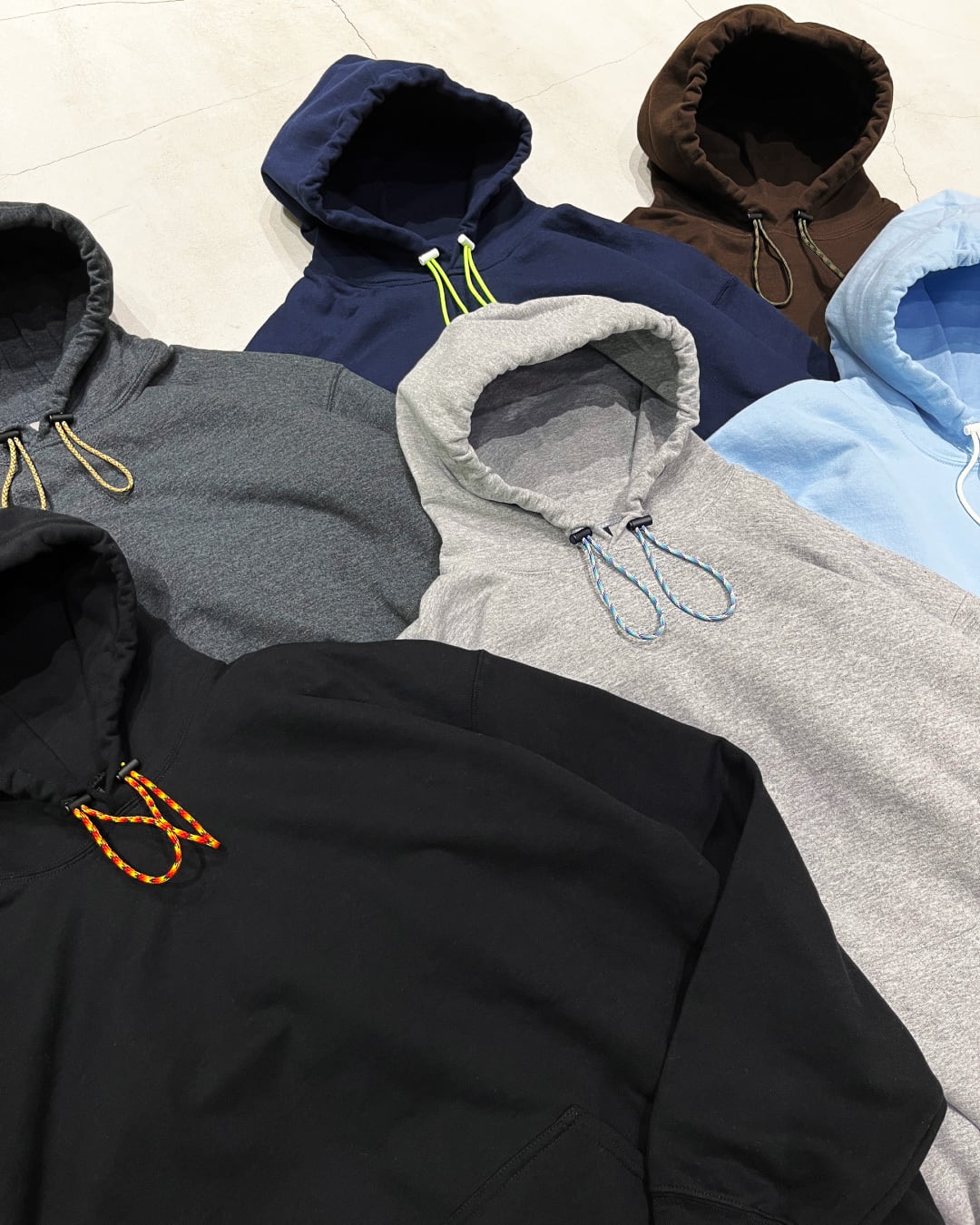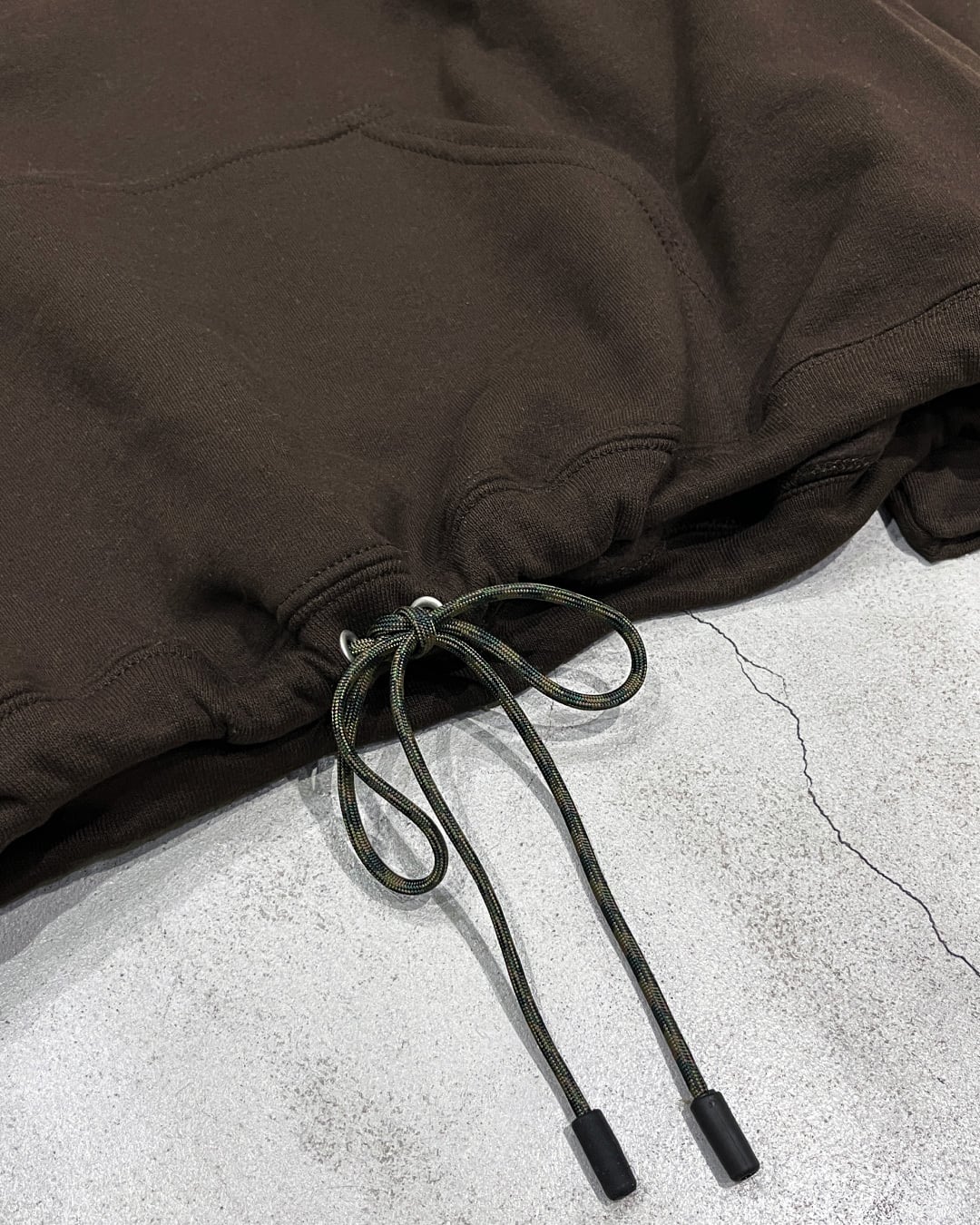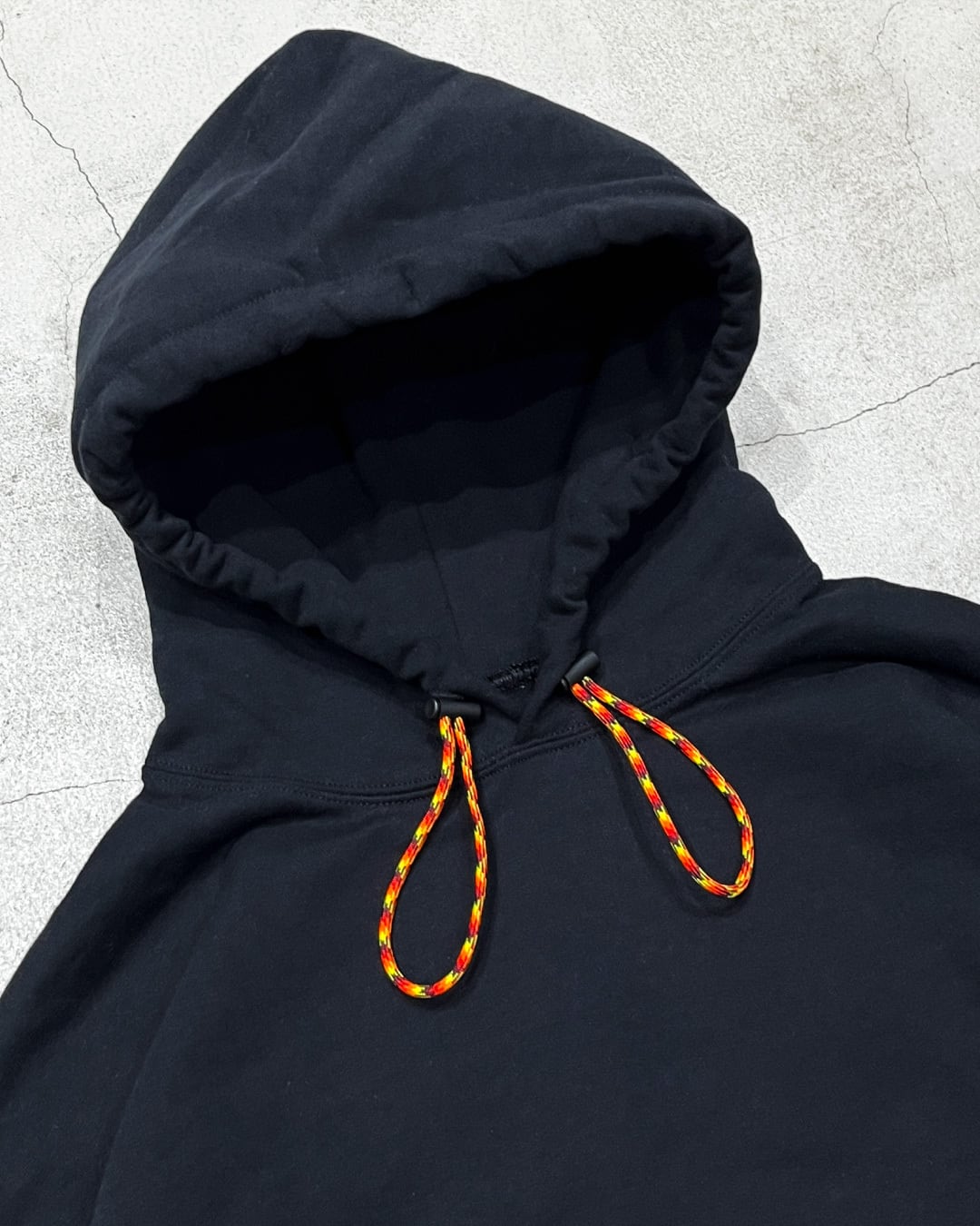 テック系のバラクラバフードにありそうなダブルループですが、派手めなパラコードがアクセントになっていてアウトドアの匂いも感じるフーディになりました。