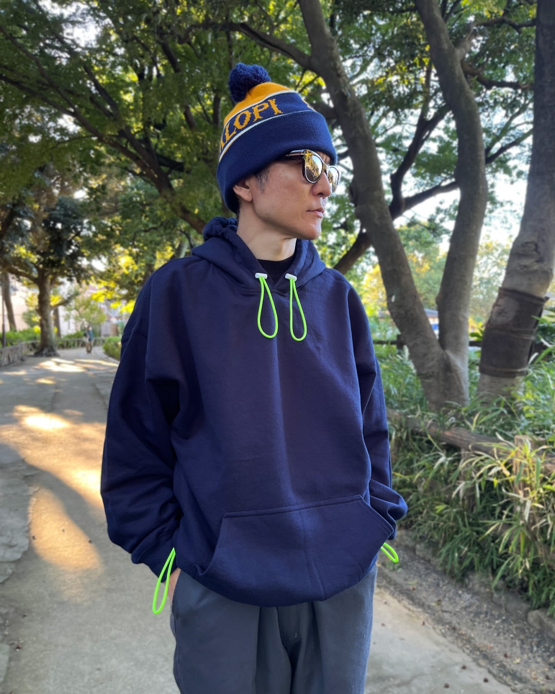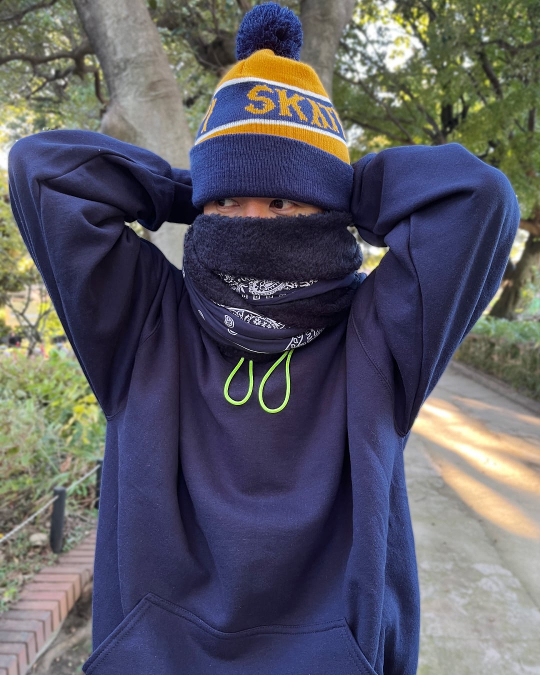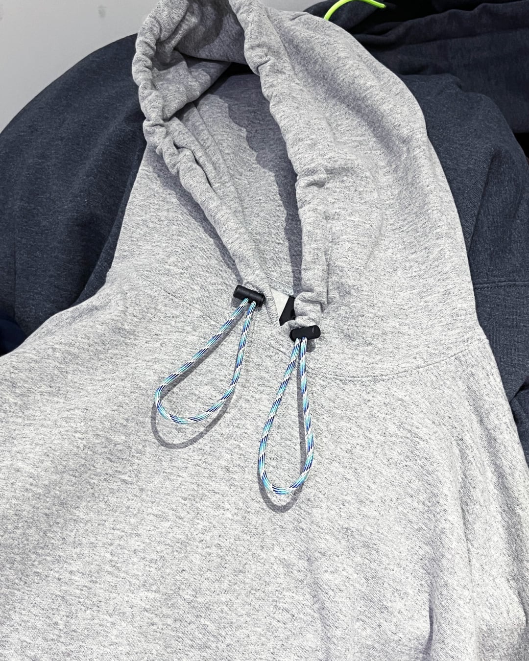 テック系のバラクラバフードにありそうなダブルループですが、派手めなパラコードがアクセントになっていてアウトドアの匂いも感じるフーディになりました。