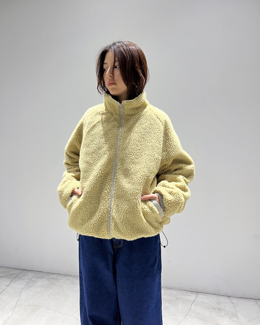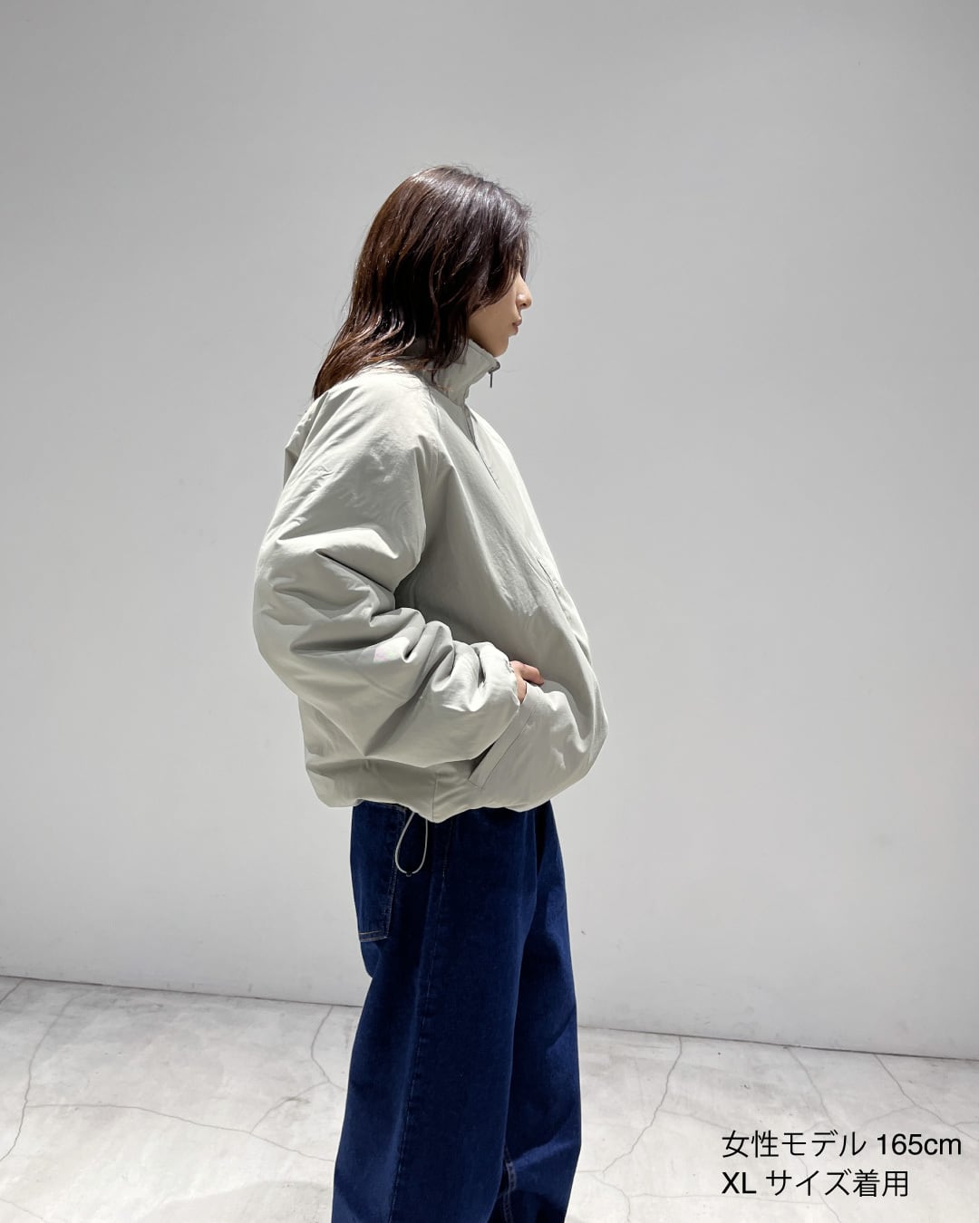 袖はラグランスリーブ仕様で、 シルエットは身幅が広めのBOX型、着丈は気持ち短めのブルゾン丈。