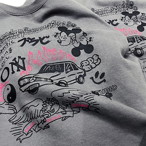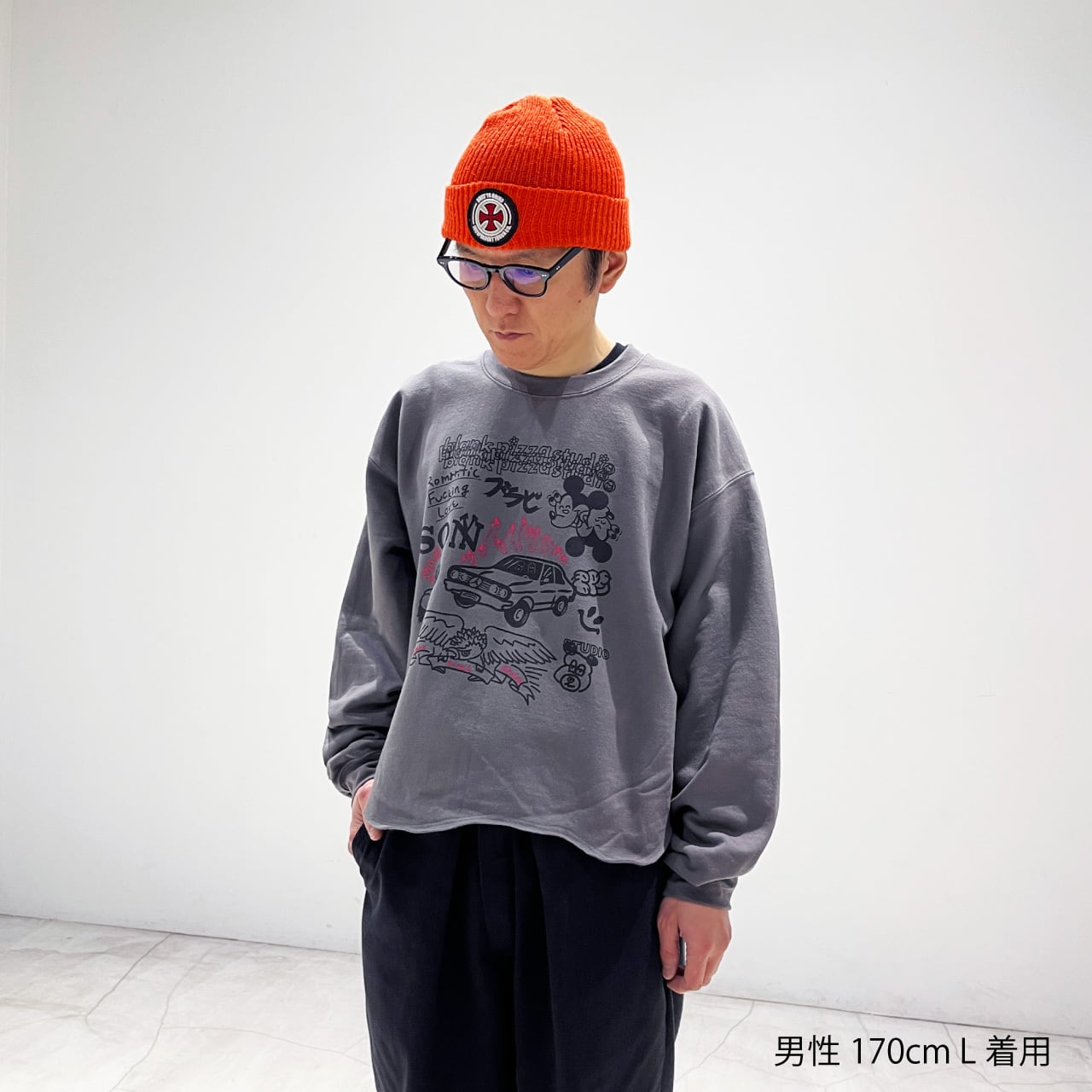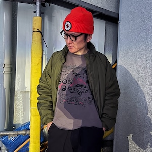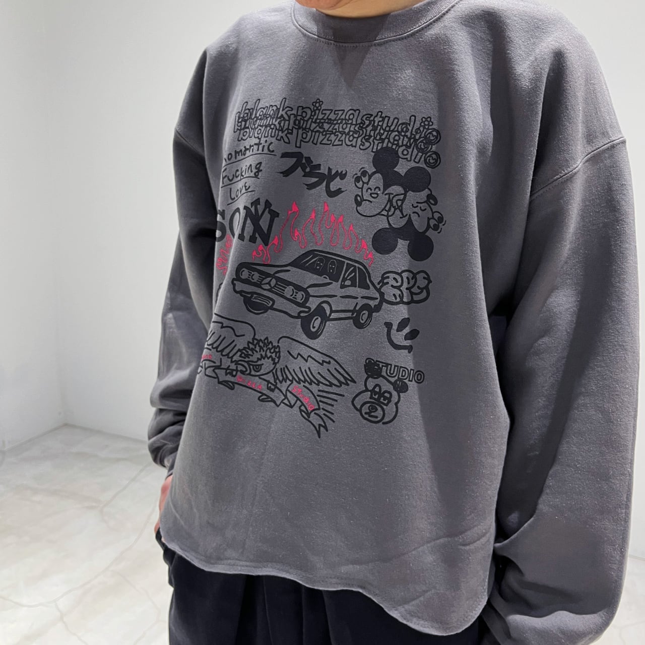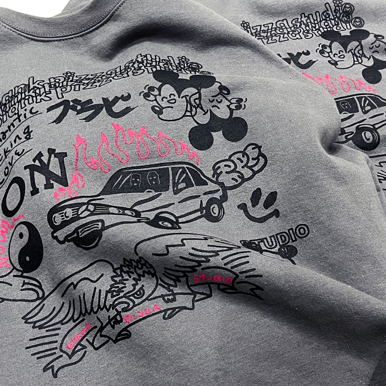 プリント屋のテストプリント用のボディをイメージしているため、プリント同士の重なりがあったり、斜めになっていたり、全然関連のなさそうなグラフィック同士が一緒になっていたりでおもしろい感じです。