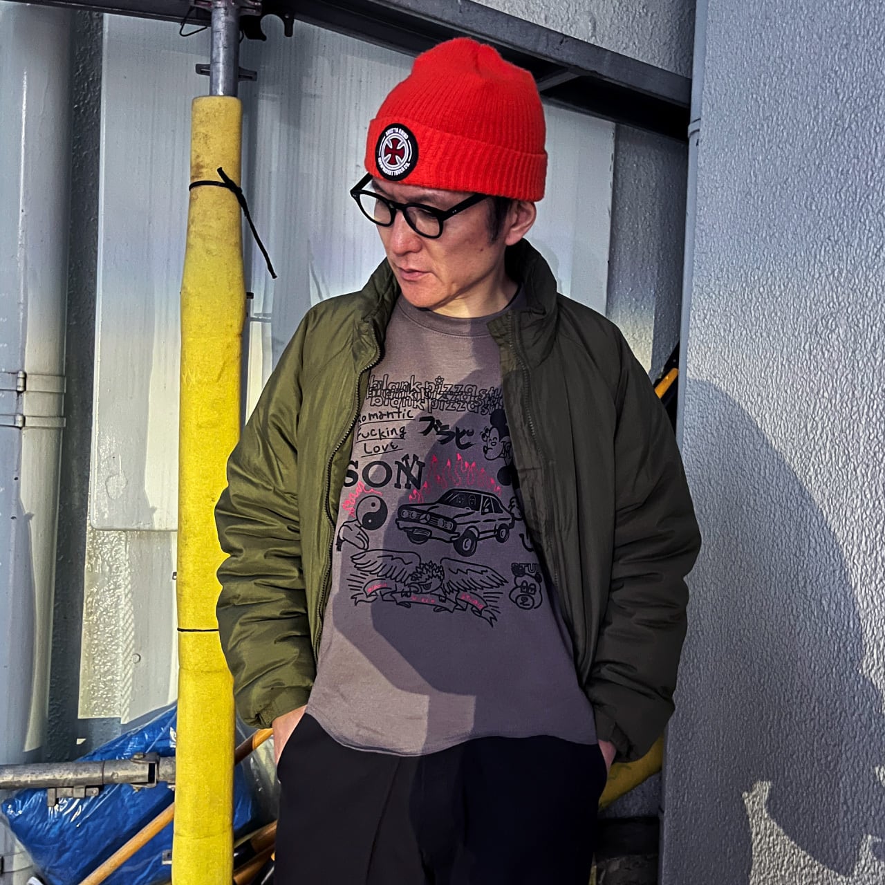 チャコールのボディ色に黒と赤の配色なので着ると意外と馴染み良くて◎