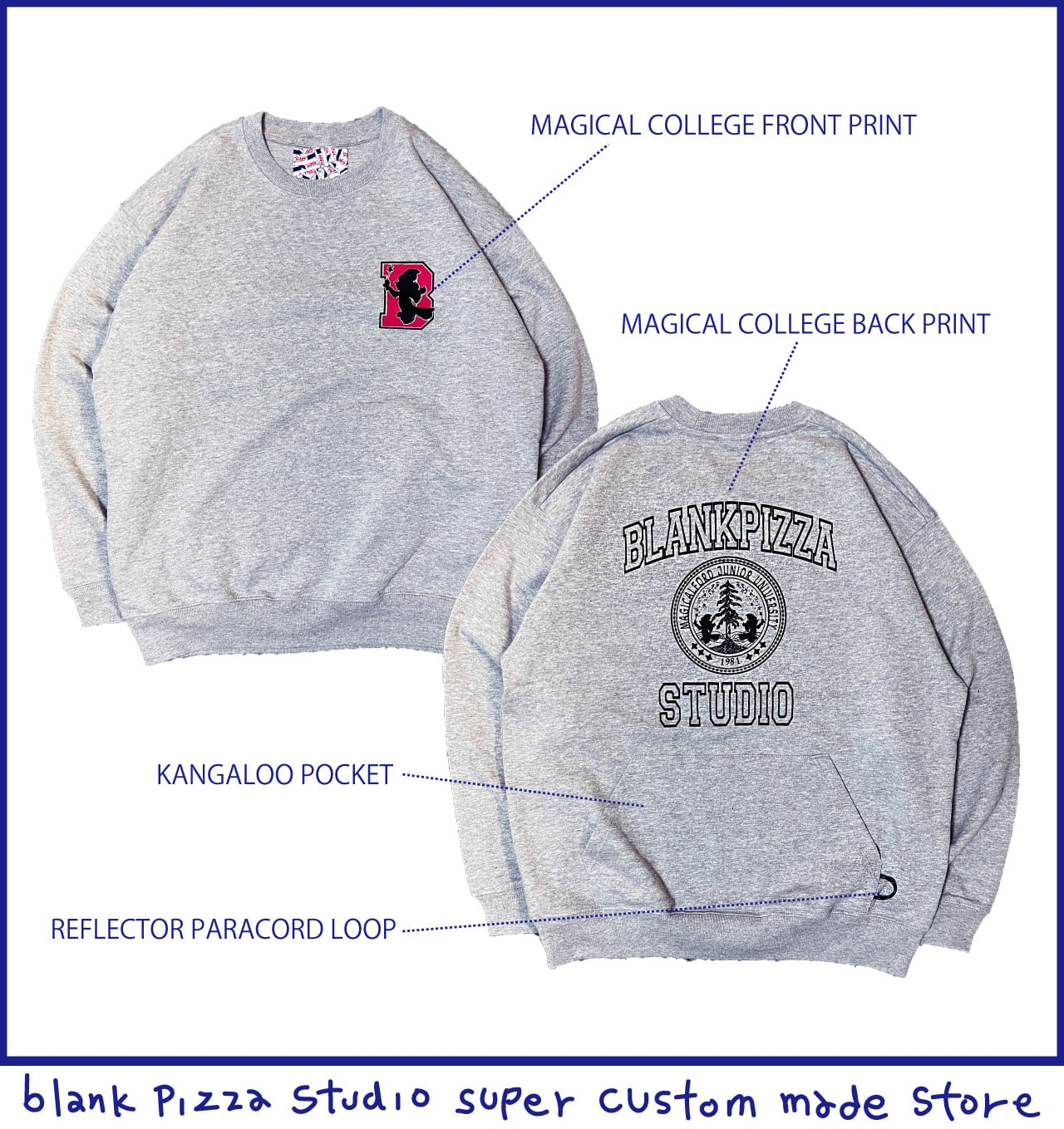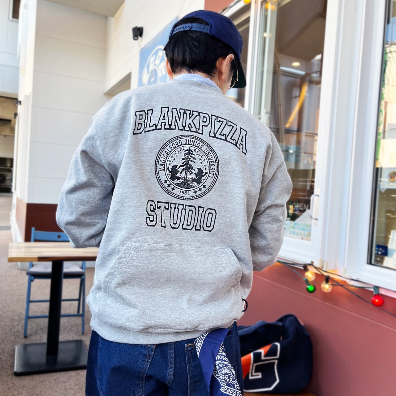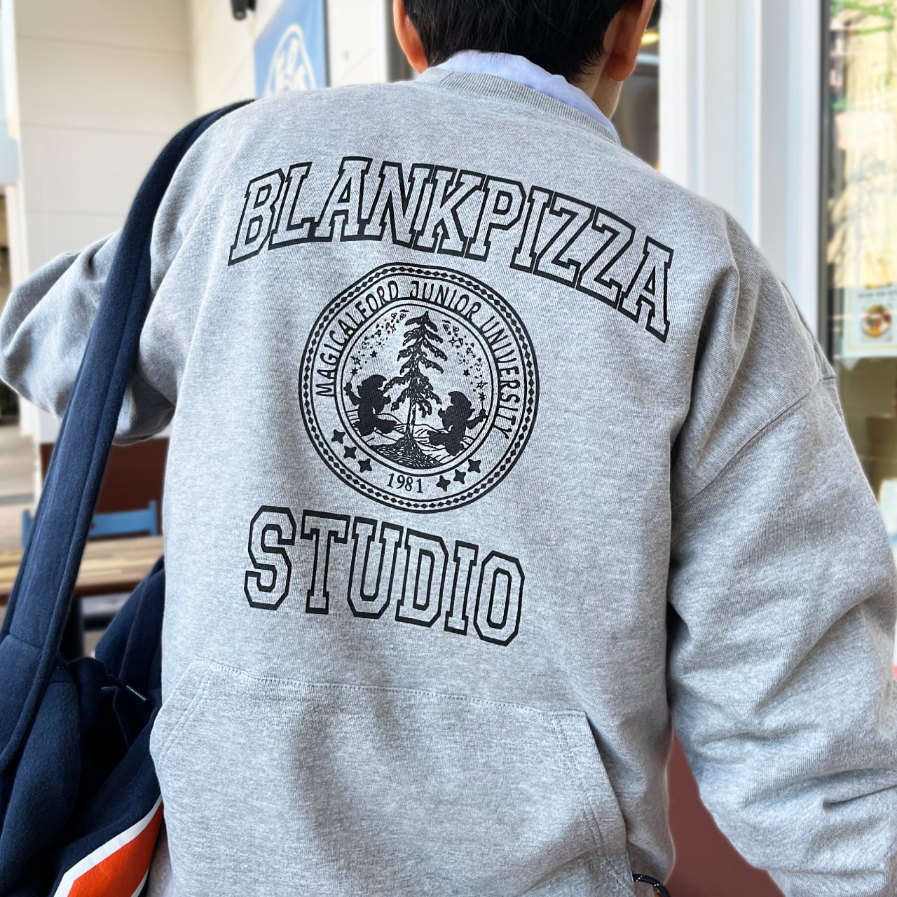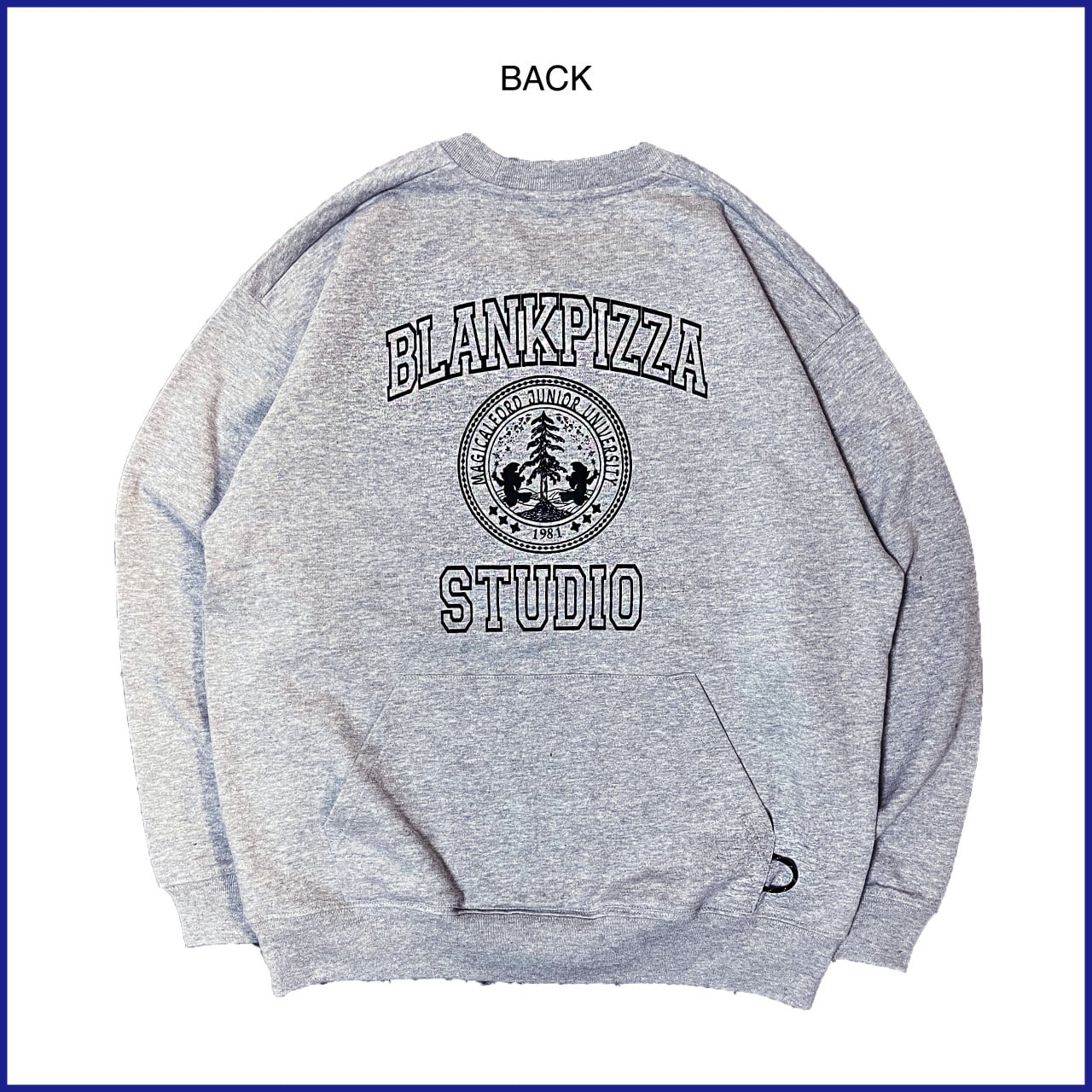 通常フロントにあるはずのカンガルーポケットをあえて背中側に後付け」したバックポケットカレッジスウェット。
