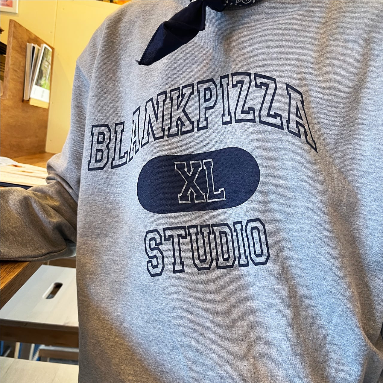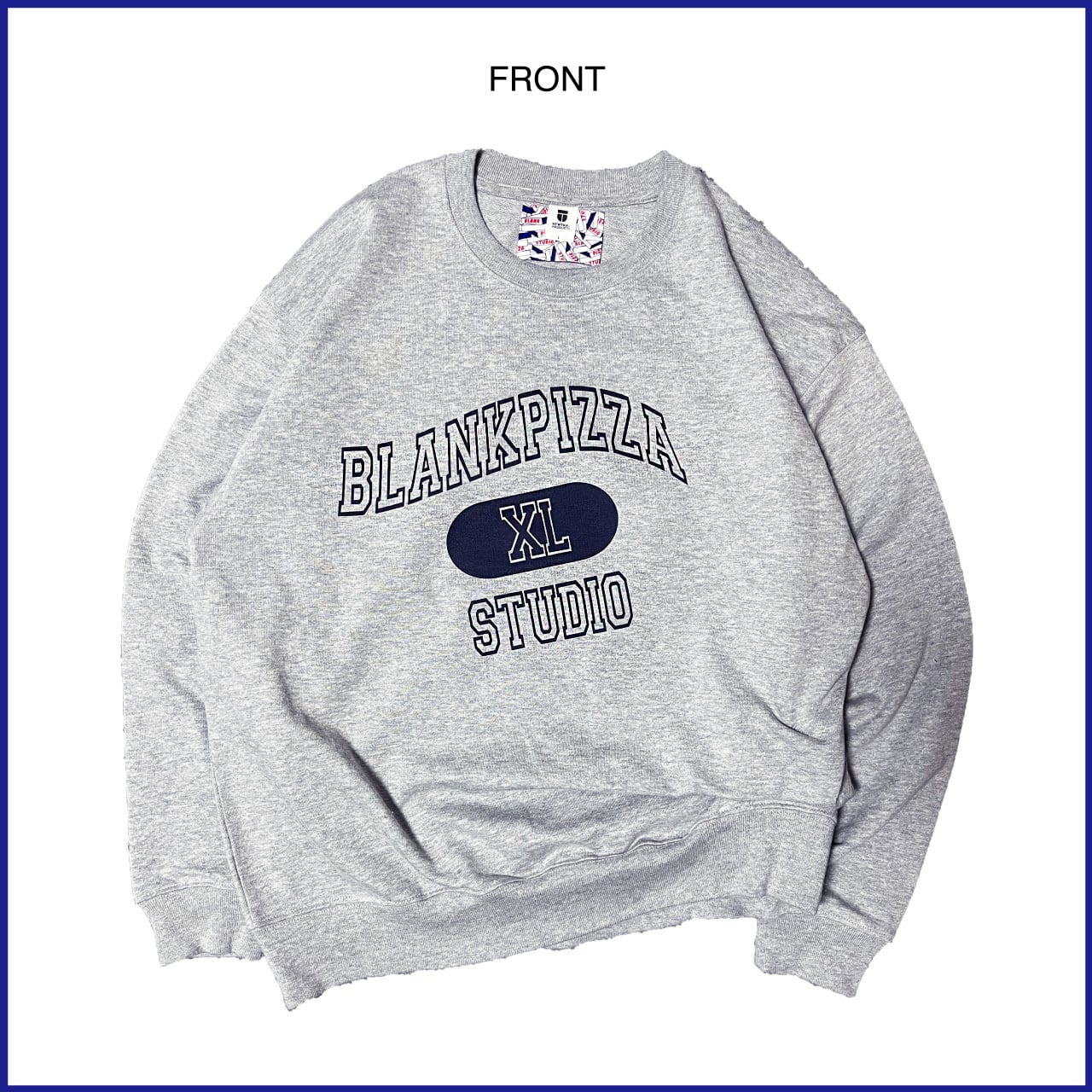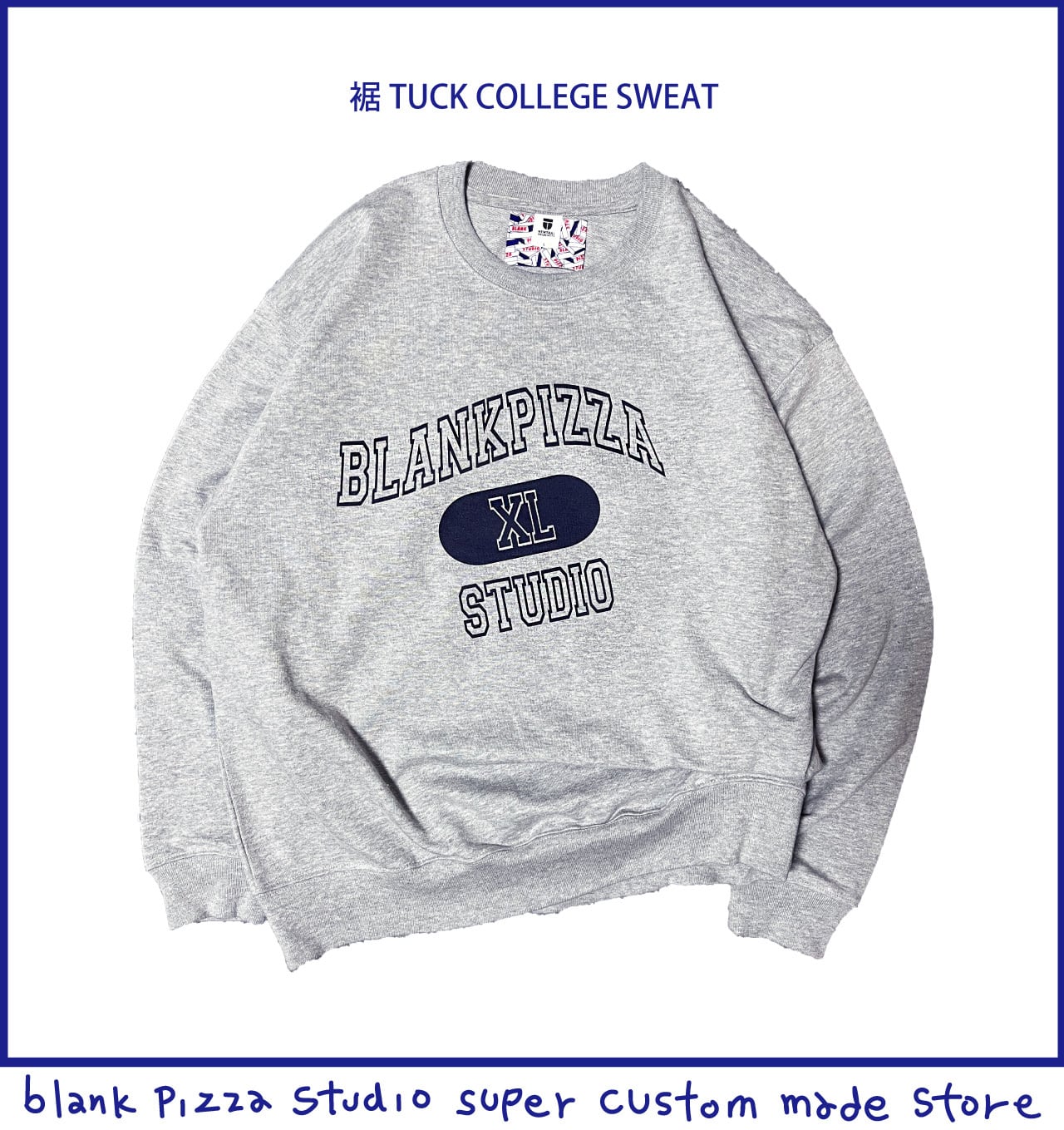 プリントはよくあるネイビーインクのカレッジロゴですが、タックのシワに引っ張られてゆがんだようなイメージをプリント。